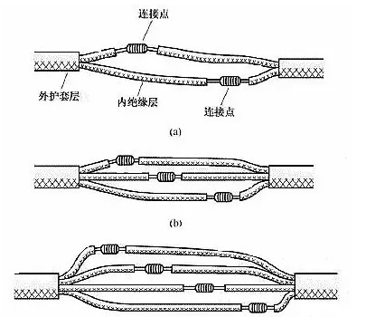 雙芯或多芯電線電纜的連接雙芯護套線三芯護套線或電纜多芯電纜在連接時,應注意盡可能將各芯線的連接點互相錯開位置,可以更好地防止線間漏電或短路圖6(a)所示為雙芯護套線的連接情況,圖6(b)所示為三芯護套線的連接情況,圖6(c)所示為四芯電力電纜的連接情況。