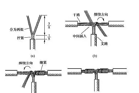 另一種方法如圖3所示,將支路芯線靠近絕緣層的約1/8芯線絞合擰緊,其余7/8芯線分為兩組[見圖3a)],一組**干路芯線當中,另一組放在干路芯線前面,并朝右邊按圖3(b)所示方向纏繞 4~5圈再將**干路芯線當中的那一組朝左邊按圖3(c)所示方向纏繞4~5圈,連接好的導線如圖3(d)所示。