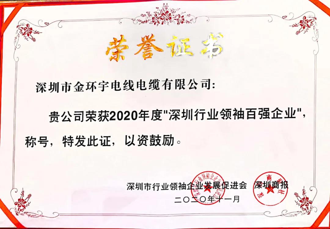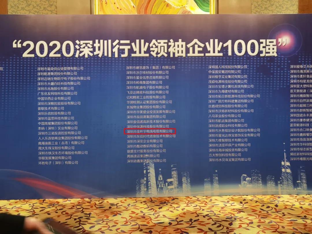 深圳市金環(huán)宇電線電纜有限公司本次很榮幸入選“2020深圳行業(yè)領(lǐng)袖企業(yè)100強”。